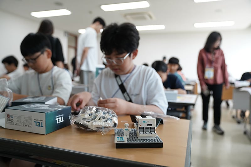 体験学習を終えた生徒たちは、サイエンス系オピニオンリーダーで、人気YouTuberの「EXO(エクソ)先生」(Lee Sunho氏)がおこなう元素と周期表、半導体についての授業に参加した。TELのオリジナルコンテンツ「AR元素周期表」も資料として活用し、生徒たちはARアプリを通じて周期表を学び、クイズを解きながらサイエンス思考力の習得に挑戦した。また、TELのエッチング装置「Tactras™」のブロック模型を組み立てる作業も、楽しみながら取り組んでいた。小学生の目線に合わせた半導体製造装置の解説によって、生徒たちは自ら好奇心をもって、装置の構造や機能を学習していた。