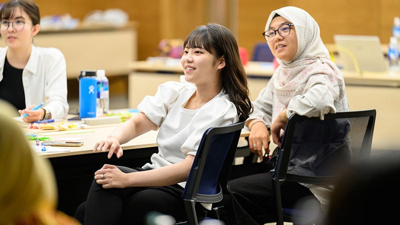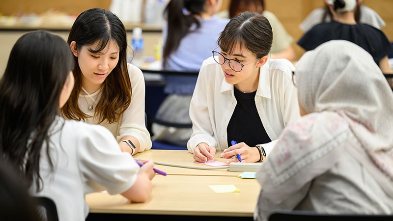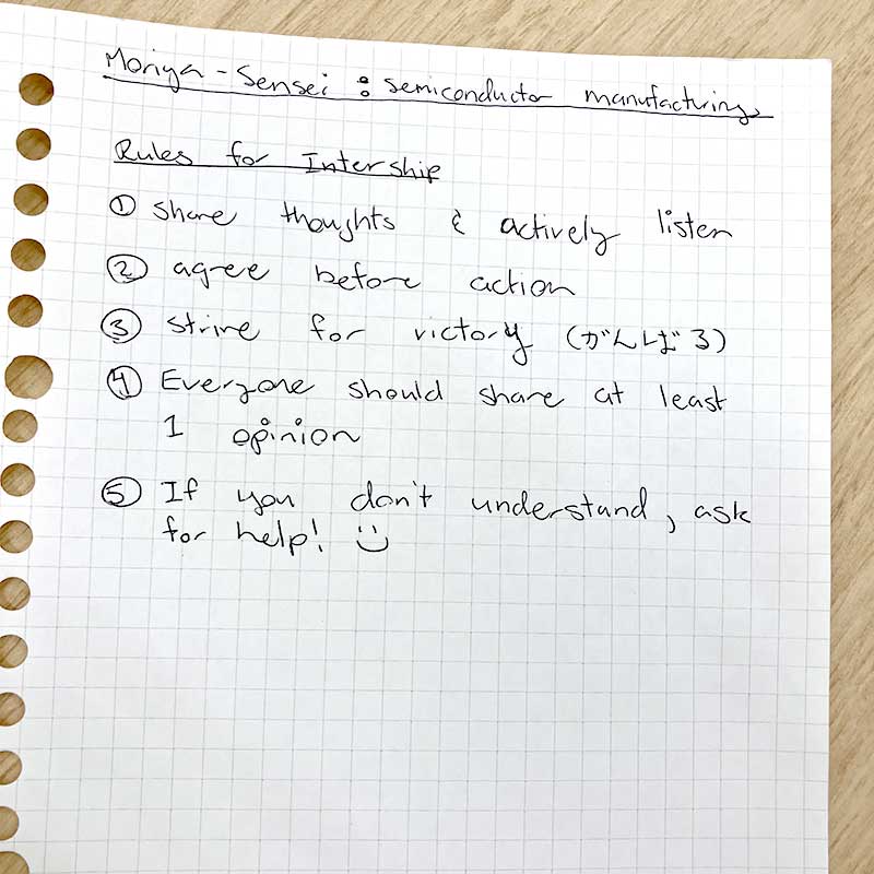 続くワークでは、ここまで学んだ半導体の知識をふまえ「半導体製造と米づくりの共通点とは?」という問題の答えを、10分間で書き出していく。異なる業界の比較に、学生たちは考え込む様子も。米づくりに馴染みのない国で育った学生に、日本の学生が稲作のプロセスを説明しながらアイデアを出し合う様子もみられた。
