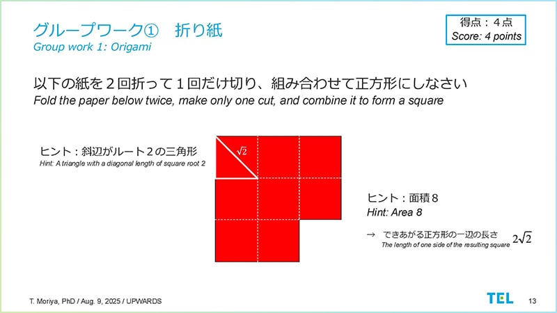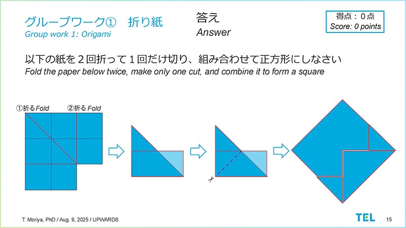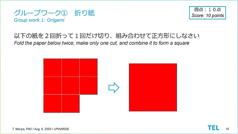 守屋は、大学院卒業後に半導体メーカーで働いたのち、「良い半導体をつくるためには半導体製造装置が重要」という思いからTELに転職した経歴をもつ。200以上の発明を特許提案してきた守屋は、「優秀なエンジニアにとって、新しいアイデアを世界で最初に思いつくことが重要」と、ひらめきの大切さを紹介。ひらめきを感覚的に掴むために最初にチャレンジしたのが、折り紙を使ったワークだ。課題は、「四隅の1つが切り取られた折り紙を、2回折って1回だけ切り、全てを組み合わせて正方形にする」というもの。