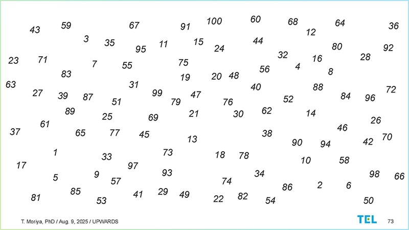 1回目の挑戦で、40まで数えられた学生もいたが、ほとんどは15前後という結果だった。2回目の挑戦の前に、ヒントが与えられた。それは、1→2→3→4と、4つのエリアで数字が順番にカウントアップしていくパターンがあるということ。パターンを知った上で再チャレンジすると、半数以上の学生はカウントできる数が増加した。