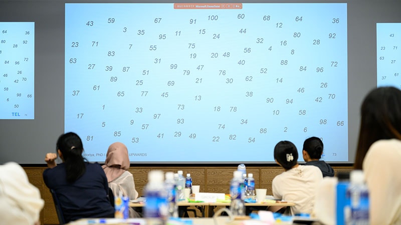 守屋は、AIと向き合う時には「人の知識とAIの融合が大切」という考えとともに、半導体製造の開発におけるAI活用事例を紹介。歩留まりや生産性向上などの課題解決、実験の効率化や材料探索にも、AIのデータ解析や機械学習が活用されている事実を知り、学生は熱心に聞き入っていた。そんなAI活用に関する理解をさらに促したのが、学生たちが挑戦した次のゲームだ。それは、スクリーン上に映し出された、ランダムに並んだ1~100の数字を、制限時間30秒で順番通りにカウントしていくものだ。