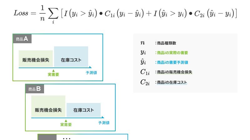 データ自体は、典型的な需要予測だ。予測値を製造計画に直接利用する状況を想定し、予測と実際の需要に応じた損失を最小化することを目指すタスクとした。つまり、予測が実際の需要よりも小さければ、販売機会損失が発生し、大きければ在庫コストが発生する。 商品は複数にまたがり、予測の上振れ・下振れのどちらが課題となるかは、商品ごとに異なるため、単純に予測精度だけを高めれば良いわけではない。実務に即した内容である。