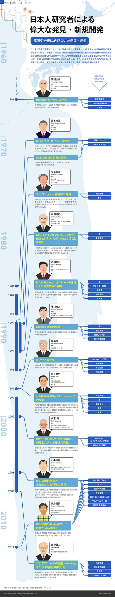 難病や障がいの克服を目指す医療の世界。 それらは研究者による偉大な発見や新規開発がなくては実現が難しいものばかりです。近年、発展を続ける日本の化学・医学界において熱意をもって研究に取り組み、世界の医学や創薬に影響を与えた日本人研究者とその発見・開発を紹介します。