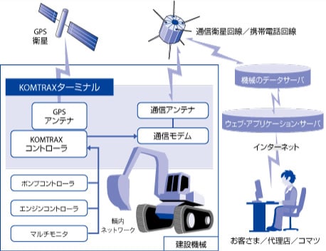 同社は、建機にGPSやセンサを取り付け、稼働中に収集したデータを携帯電話や通信衛星経由で自動送信してサーバーに蓄積、分析・活用する「KOMTRAX」と呼ぶシステムを構築している。もともと盗難防止を目的として作られたシステムだが、現在では、車両の位置の他にも、オーバーヒートやエンジンオイルの油圧低下といった各種警報の有無、稼働状況、燃料の状況などのさまざまなデータを収集している。これによって、世界各地で稼働する自社製の建機を日本にいながらにして集中管理できるようにしている。