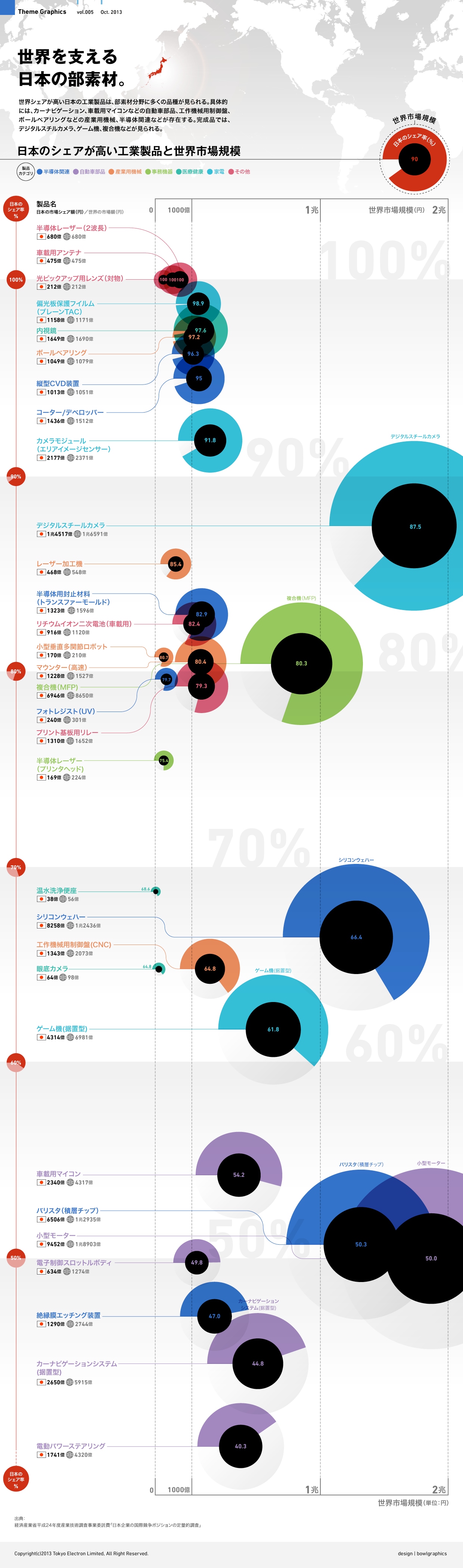 まず、世界シェアが高い日本の工業製品として、実際にどのような製品があるのか、統計データより「日本のシェアが高い工業製品と世界市場規模」としてグラフィック化した。結果として、デジタル・デバイスに関連する部素材が強いことが伺える。