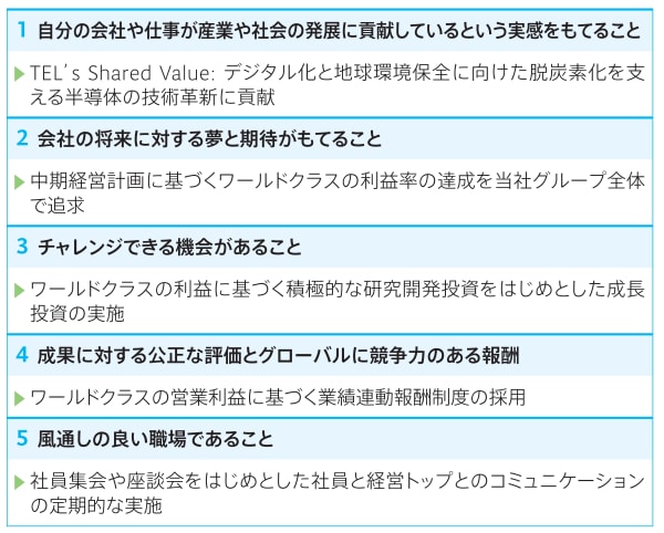 当社では、「企業の成長は人。社員は価値創出の源泉」という考えのもと、社員が能力を最大限に発揮できるよう、社員の意欲と会社へのエンゲージメントを高めるため、次の5つのポイントからなる「やる気重視経営」に取り組んでいます。