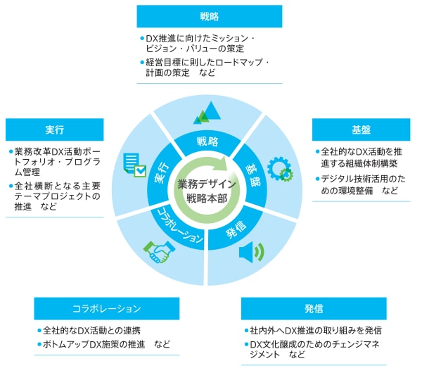 また、DXのさらなる推進に向け、業務部門とIT部門が迅速かつシームレスに連携する体制を構築するため、本社およびグループ全社のIT部門を統合し再編するとともに、業務デザイン戦略本部として当社の重要な本部組織の1つに位置づけました。これにより、グローバルでのガバナンス強化とともに、DX推進体制を一層強固なものとしています。