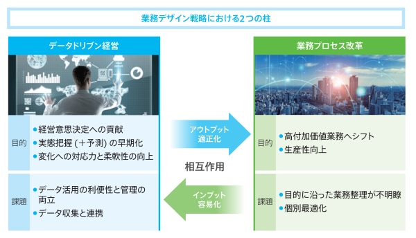 当社では、これまで拠点や部門ごとにサイロ化されたシステムとデータ活用による個別最適の業務改善が中心でしたが、現在は業務工数の増大や投資の非効率性などの観点から課題を洗い出し、グループ全体での統合的な業務改善の実現に取り組んでいます。具体的には、「データドリブン経営」と「業務プロセス改革」の2つの柱を軸にグループ全体で業務改革DXを推進し、相互作用によるシナジー創出を目指した取り組みを加速しています。