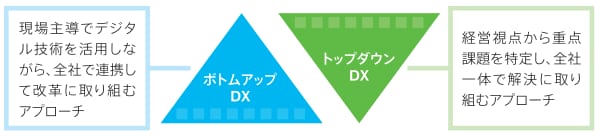 当社グループにおける業務改革DX活動のアプローチには、トップダウンDXとボトムアップDXがあります。経営視点から重点課題を特定し、全社一体で解決していく「トップダウンDX」は、案件ごとにプロジェクト化して改革に取り組みます。また、現場主導で進める「ボトムアップDX」は、デジタル技術を活用しながら全社で連携して改革に取り組みます。トップダウンDXとボトムアップDXの両輪で取り組みを推進することで、経営および現場の双方向で主体的かつ継続的にDXによる業務改革を実現していくことを目指しています。