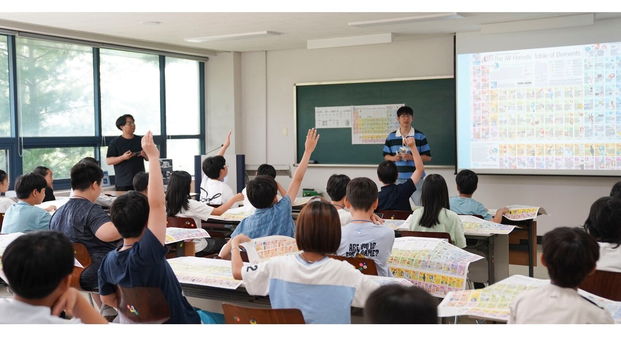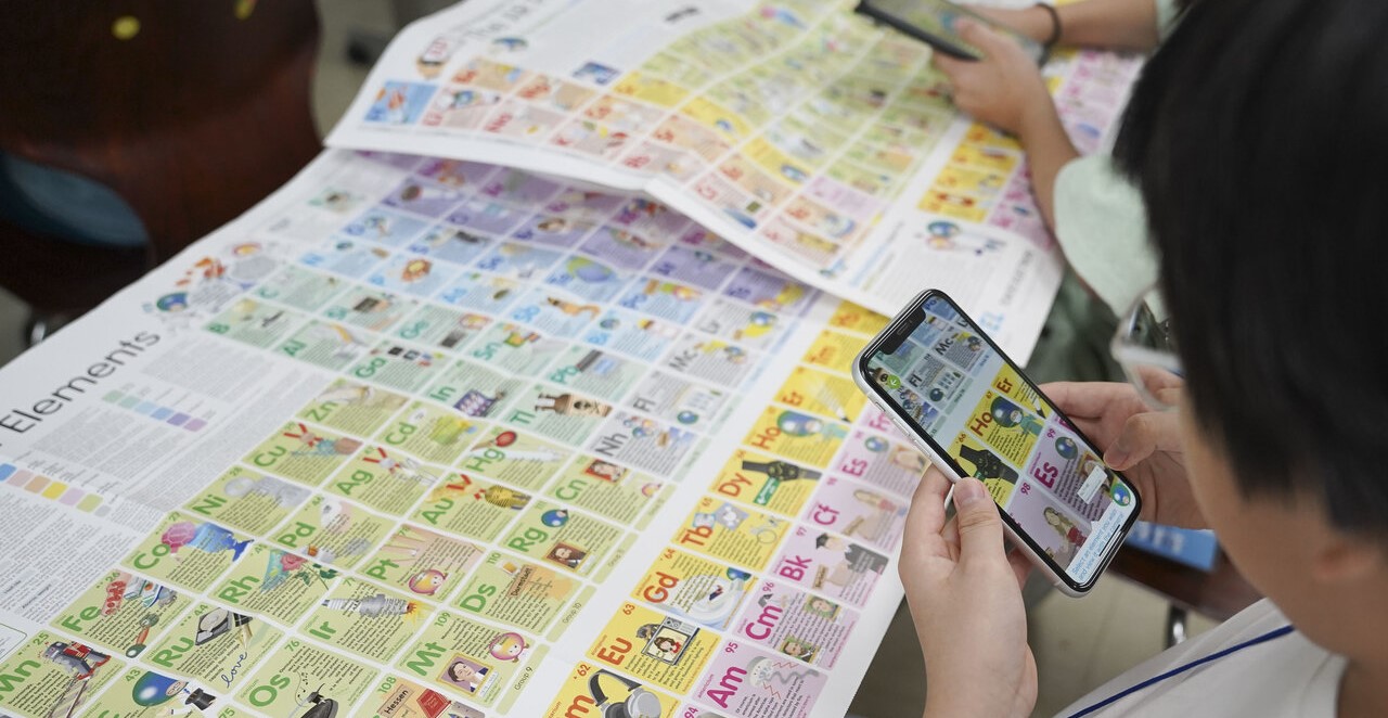 3時間目:TELのオリジナルコンテンツ「AR元素周期表」を資料として活用し、生徒たちはARアプリを通じて周期表を学び、クイズを解きながらサイエンス思考の習得に挑戦しました。