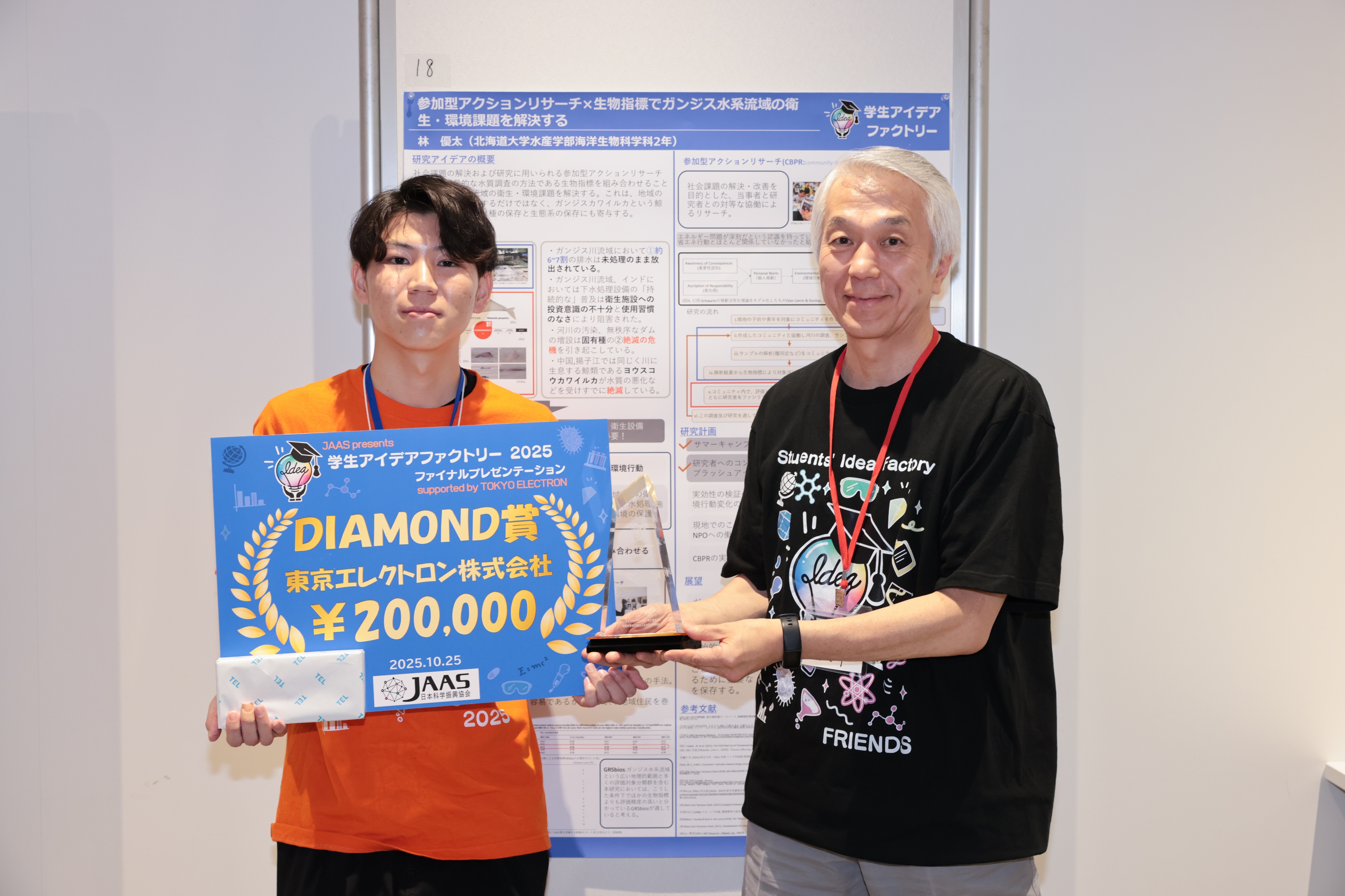 今年度TELは、北海道大学水産学部・林 優太(はやし ゆうた)さんの研究アイデア「参加型アクションリサーチ×生物指標でガンジス水系流域の衛生・環境課題を解決する」に、「ダイヤモンド賞」を授与いたしました。